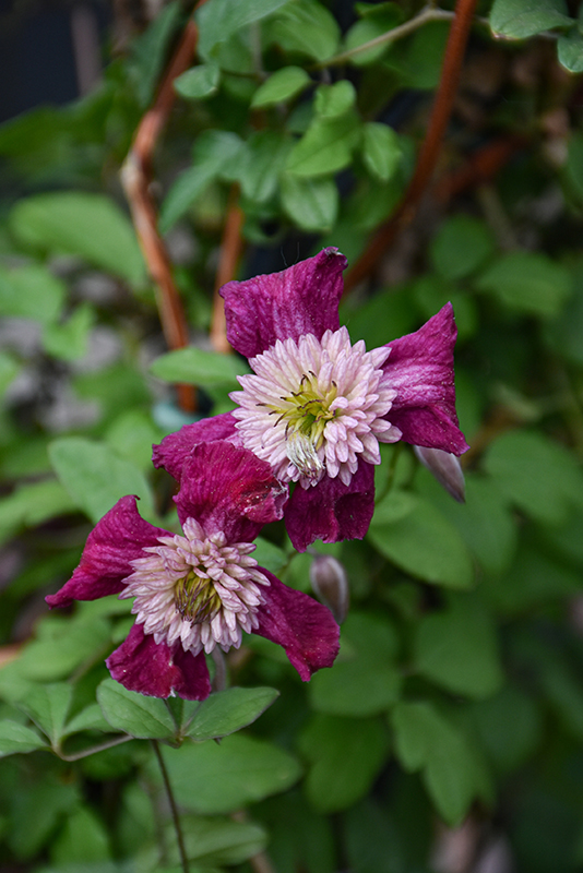 Avant-Garde Clematis features showy double fuchsia star-shaped flowers with shell pink centers at the ends of the branches from late spring to early fall. It has green deciduous foliage. The compound leaves do not develop any appreciable fall color.