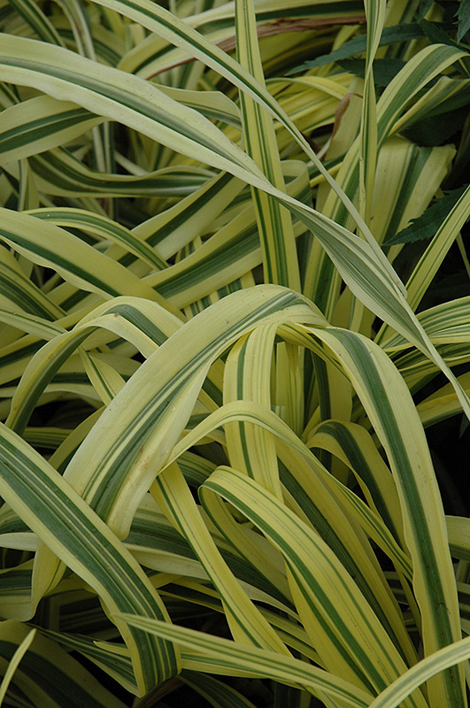 Rich, velvety golden trumpets with a darker gold throat emerge above striking butter yellow and green striped foliage that is as showy as the flowers; excellent for the front of borders where the foliage can be appreciated after the blooming is finished