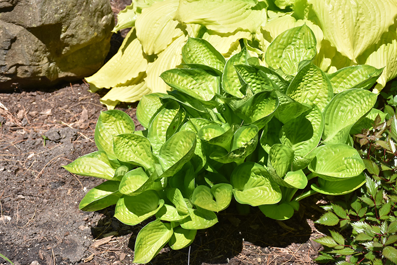 This variety produces solid green leaves when they emerge and quickly develop dark green borders and bright gold centers; provides beautiful texture and contrast to other plants; light lavender spikes of flowers in mid-summer